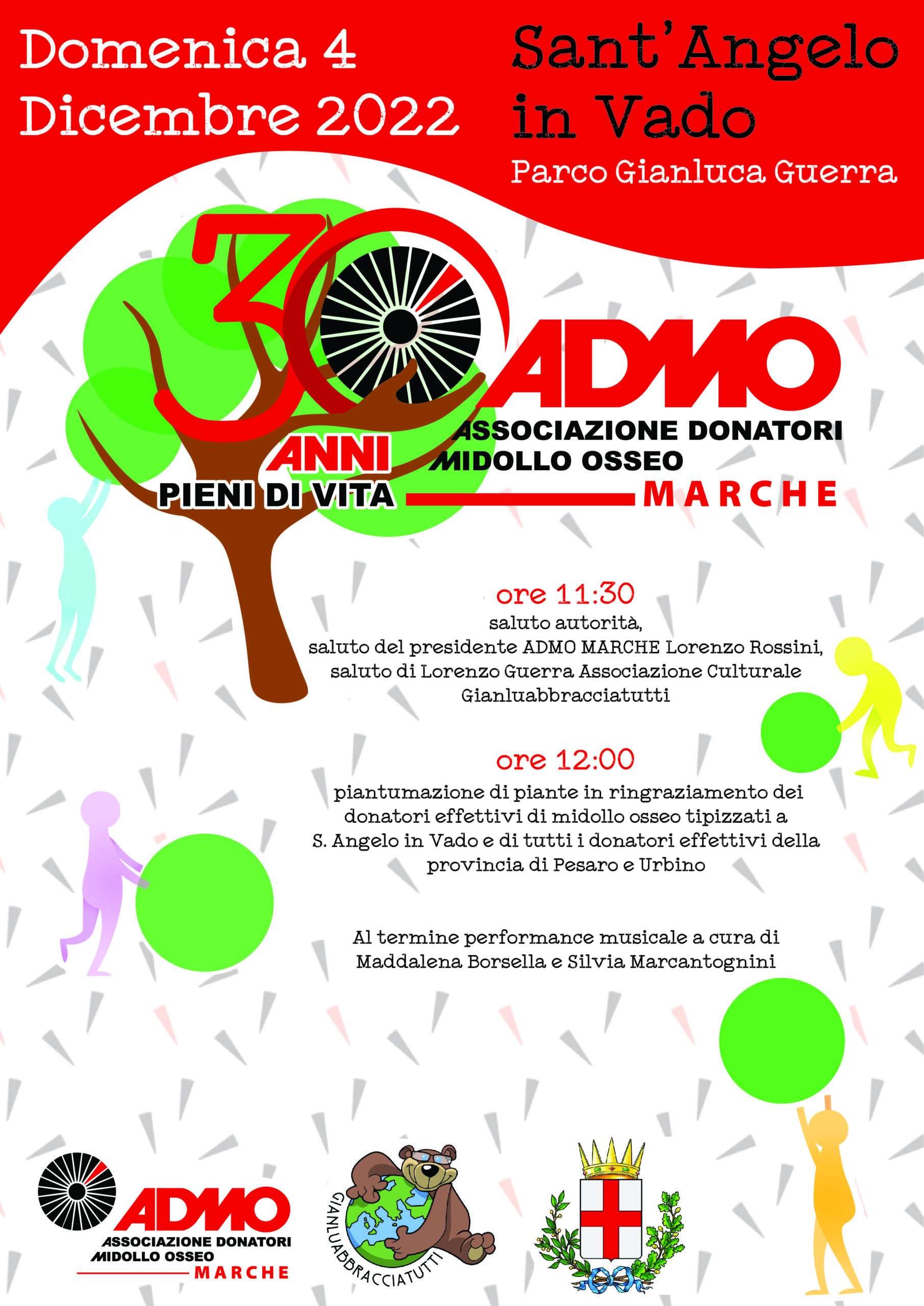 Il programma che trovi nella locandina si può riassumere così: Si inizia con il saluto delle autorità, il ringraziamento e la partecipazione dei fondatori dell’Associazione e le testimonianze di coloro che hanno donato o ricevuto il midollo osseo. Poi omaggeremo i 95 donatori di midollo osseo che, in questo trentennio, hanno contribuito concretamente a salvare una Vita, insieme agli ematologici, biologi, trasfusionisti e sanitari che hanno condiviso personalmente questi incredibili percorsi di rinascita. Verrà loro consegnato un digital badge, di cui solo chi ha donato può fregiarsi. Lo potrà utilizzare come riconoscimento per lo straordinario gesto di generosità e mostrarlo sulla propria mail, sul proprio curriculum, sui suoi social affinché si sappia che ci si trova davanti ad un cittadino benemerito. Il pomeriggio inizia con un picnic sul prato allietato dai “Senza Giacca” e poi tanto sport all’aria aperta alla presenza delle società sportive VL Carpegna Prosciutto Pesaro, Italservice Pesaro Calcio a 5 con alcuni giocatori in rappresentanza delle squadre, che animeranno il pomeriggio in campi attrezzati dal CSI per la gioia di bambini e ragazzi che vorranno fare un tiro a canestro, un calcio in porta con i campioni della loro città: oltre ad altri sportivi del territorio, sarà gradito ospite anche lo scrittore e autore Francesco Gazzé in veste di maestro di city tennis, con momenti dimostrativi/aggregativi per giovani e adulti che vorranno provare questa nuova disciplina. Alle 17 e, all’interno del Parco Miralfiore verrà realizzato il “1 ‘ Giardino del Tempo ” costituito da tante piante quanti sono i donatori di Vita. Di seguito alcune immagini della giornata e il video promozionale con il Maestro Giovanni Allevi.